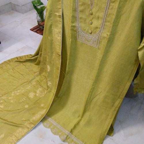 Pure Silk Zari Embroidered Unstitched Suit with Scalping On Panel Woven Dupatta