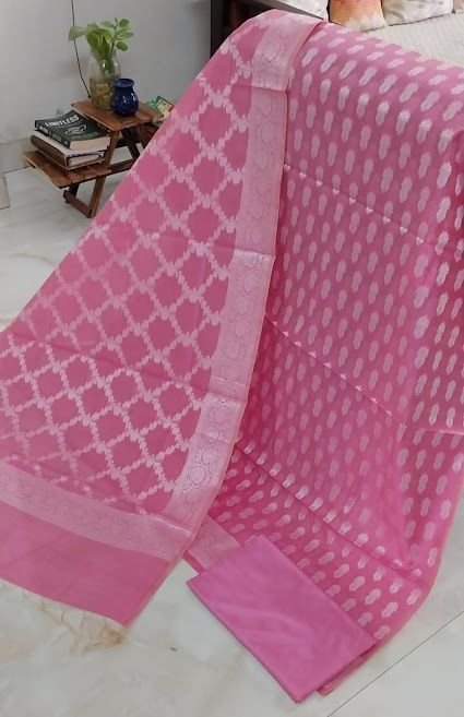 We offer a Pink Silk Handwoven Unstitched Suit with Chiffon Dupatta, perfect for formal and festive occasions. Made from premium silk woven with a chiffon dupatta, this set features exquisite Kheen Khab work design. The color is a vibrant pink, ideal for the summer season. Each component measures 2.5, ensuring a perfect fit. Care instructions recommend avoiding machine wash. This suit is a must-have for those who appreciate quality and elegance. Ideal for exporters, suppliers, and traders looking to offer high-quality ethnic wear to their customers.