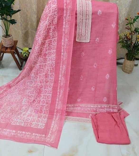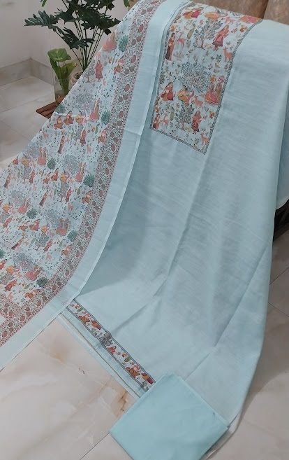 We offer a premium Muga Cotton Print Unstitched Suit with Madhubani Print Bottom and Pure Cotton Dupatta, sourced from India. This daily wear ensemble features a printed pattern, anti-wrinkle fabric, and attractive design. The unstitched suit allows for customization, making it a versatile choice for any occasion. The fancy printed cotton dupatta adds a touch of elegance. Ideal for exporters and suppliers looking for high-quality cotton products with unique Indian craftsmanship.