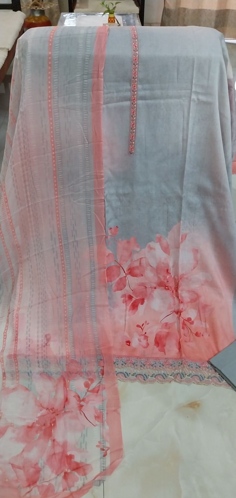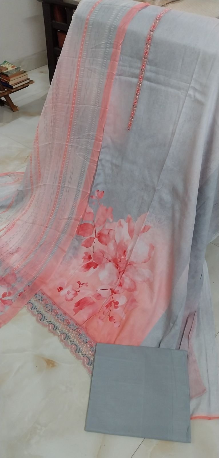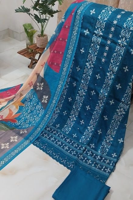 We are proud to offer exquisite Pure Cotton Digital Printed Embroidered Unstitched Suits originating from India. Crafted from high-quality cotton material in multicolor hues, these suits come in regular fit sizes. The set includes a top with digital prints, a bottom made of pure cotton, and a chiffon dupatta with digital prints. Perfect for casual wear, these unstitched suits cater to various business categories like exporters, retailers, and traders. Elevate your style with this versatile and elegant ensemble that combines traditional craftsmanship with modern design.