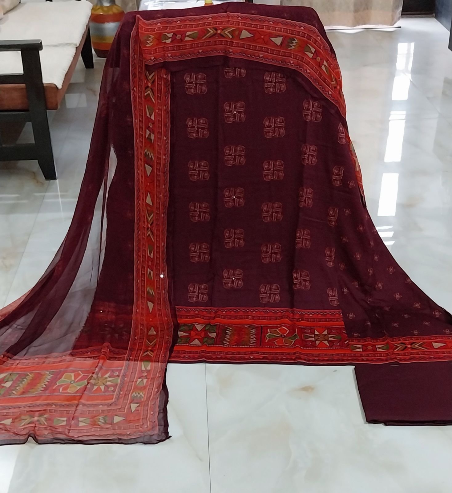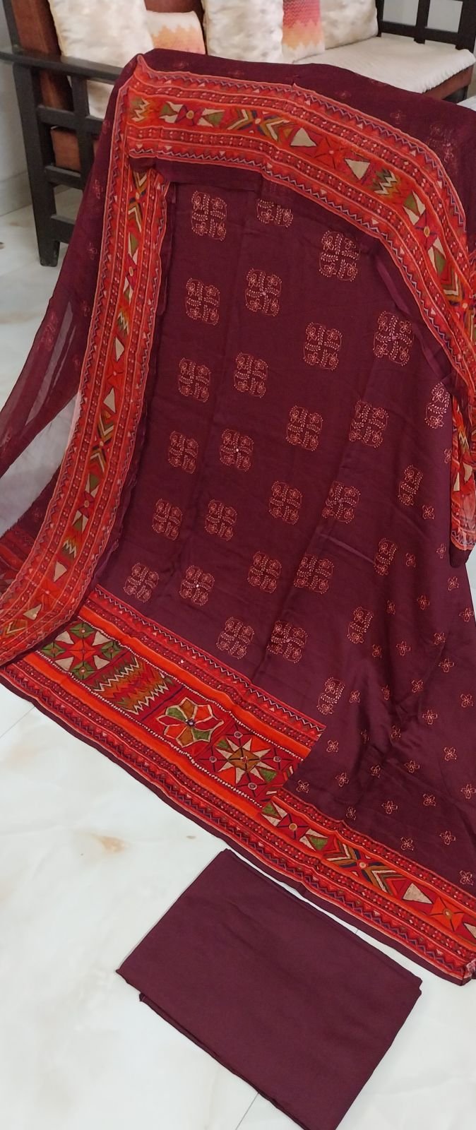 Leading Exporters, Retailer and Trader of Burgandy Pure Cotton Embroidered Digital Printed Unstitched Suit, Glace Cotton Beautifully Embroidered Unstitched Suit with Mul Cotton Embroidered Dupatta, Glace Cotton Printed Bottom Cotton Rayon Dupatta Unstitched Suit, Pure Cotton Digital Printed Embroidered Unstitched Suits and Pure Glace Cotton Bandhni Print Embroidered Unstitched Suit from Gurugram.